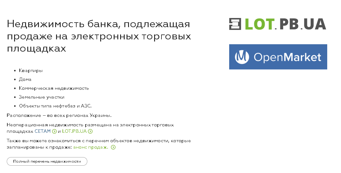 Некоторые объекты недвижимости их списка предлагаются для аренды. Ознакомиться с их списком и выбрать из него подходящую под собственные предпочтения и финансовые возможности позицию можно перейдя по ссылкам на электронные площадки Setam и Приват аукцион, с официальном сайте ПриватБанка, где он анонсирует о продажах. В этих ресурсах можно найти информацию обо всех ресурсах, которые можно купить через ПриватБанк.