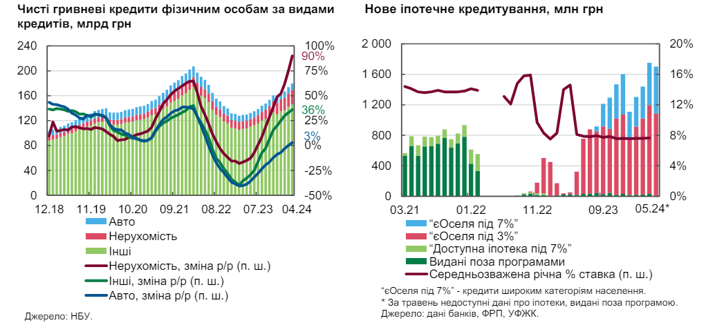 Населення все активніше користується позиковими коштами: співвідношення кредитів і витрат споживання наближається до історично найвищих показників. Найшвидше збільшується іпотечний портфель: за рік завдяки державній програмі «єОселя» він зріс майже вдвічі (з низької бази). Умови програми змінили профіль іпотечного кредиту проти довоєнних показників: розмір власного внеску домогосподарств знизився, а термін кредиту зріс.