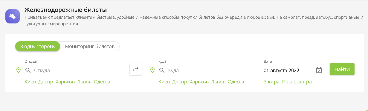 Через додаток ПриватБанку можна купити квитки на потяг, літак або автобус. Система фінансової установи дозволяє здійснити операцію за умови, що до відправлення залишилося не більше 30 хвилин. Проте, якщо купувати квитки заздалегідь, можна обрати кращі місця.
