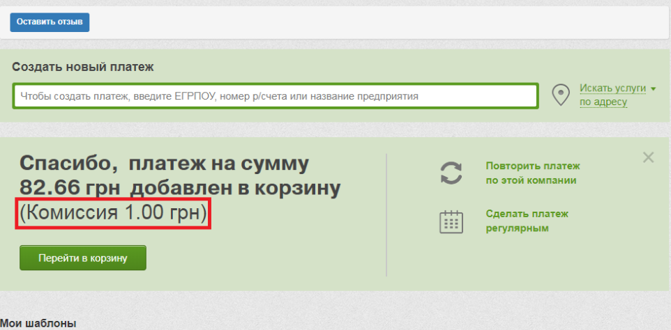 - вибір потрібного шаблону платежу або, якщо його немає, ввести назву або податковий код постачальника послуг, після чого обрати організацію із запропонованого списку;