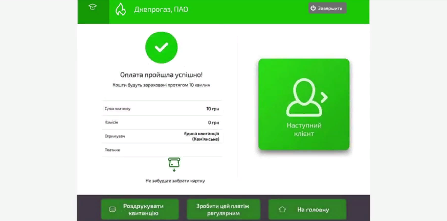 - Дочекатися завершення операції і роздрукувати квитанцію або відмовитися від її отримання.